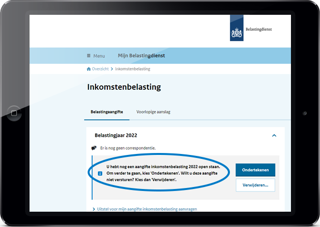 Als u uw aangifte wel ingevuld hebt, maar nog niet hebt verstuurd, dan staat daar: ‘U hebt nog een aangifte inkomstenbelasting 2022 open staan. Om verder te gaan, kies 'Ondertekenen’. Wilt u deze aangifte niet versturen? Kies dan 'Verwijderen'.