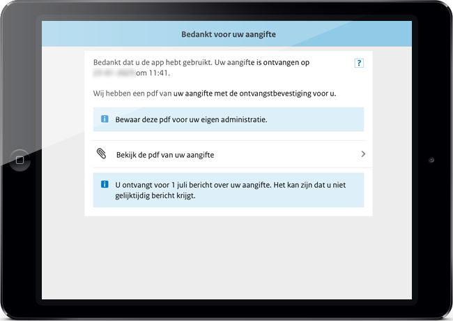 Als u aangifte hebt gedaan met de app, ziet u op het laatste scherm 'Bedankt voor uw aangifte'. Hierop staat de ontvangstdatum en -tijd van uw aangifte. Ook ziet u een pdf van uw aangifte met de ontvangstbevestiging.