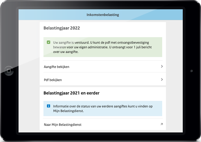 Wilt u later in de aangifte-app nog eens checken of wij uw aangifte hebben ontvangen? Log dan in op de app. Als wij uw aangifte hebben ontvangen, ziet u meteen op het scherm 'Inkomstenbelasting' de melding 'Uw aangifte is verstuurd. U kunt de pdf met ontvangstbevestiging bewaren voor uw eigen administratie. U ontvangt voor 1 juli bericht over uw aangifte'.
