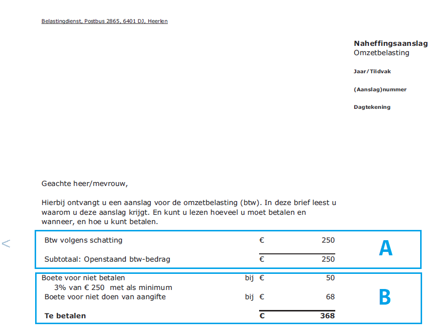 Hieronder staat een voorbeeld van een naheffingsaanslag voor de btw. Onder de afbeelding staat de uitleg.