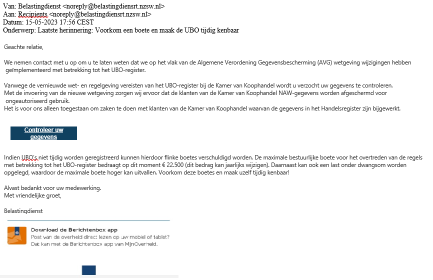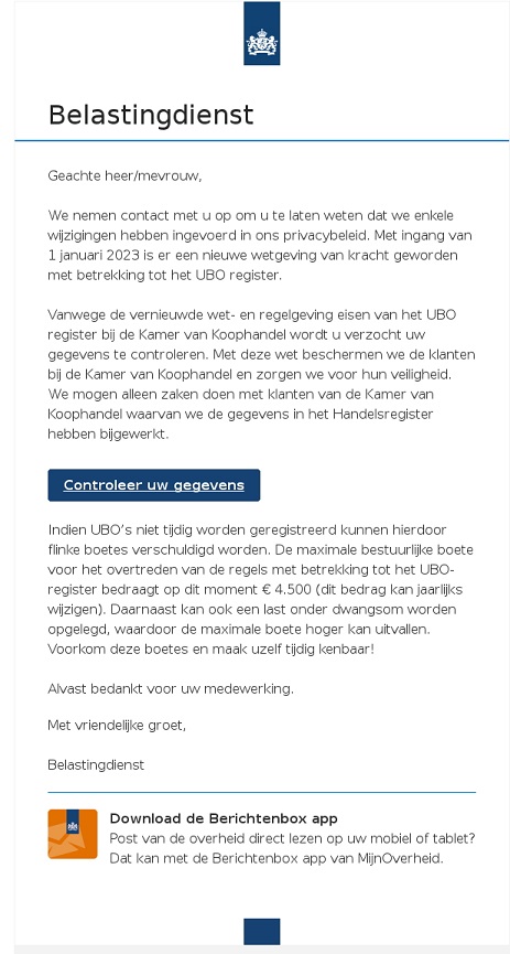 Momenteel is er een valse e-mail in omloop die afkomstig lijkt van de Belastingdienst. In deze mail staat dat u uw UBO-gegevens bij de Kamer van Koophandel moet controleren. Daarom moet u in de e-mail op de knop 'controleer gegevens' klikken. U wordt ook gewezen op de mogelijkheid de Berichtenbox app te downloaden.