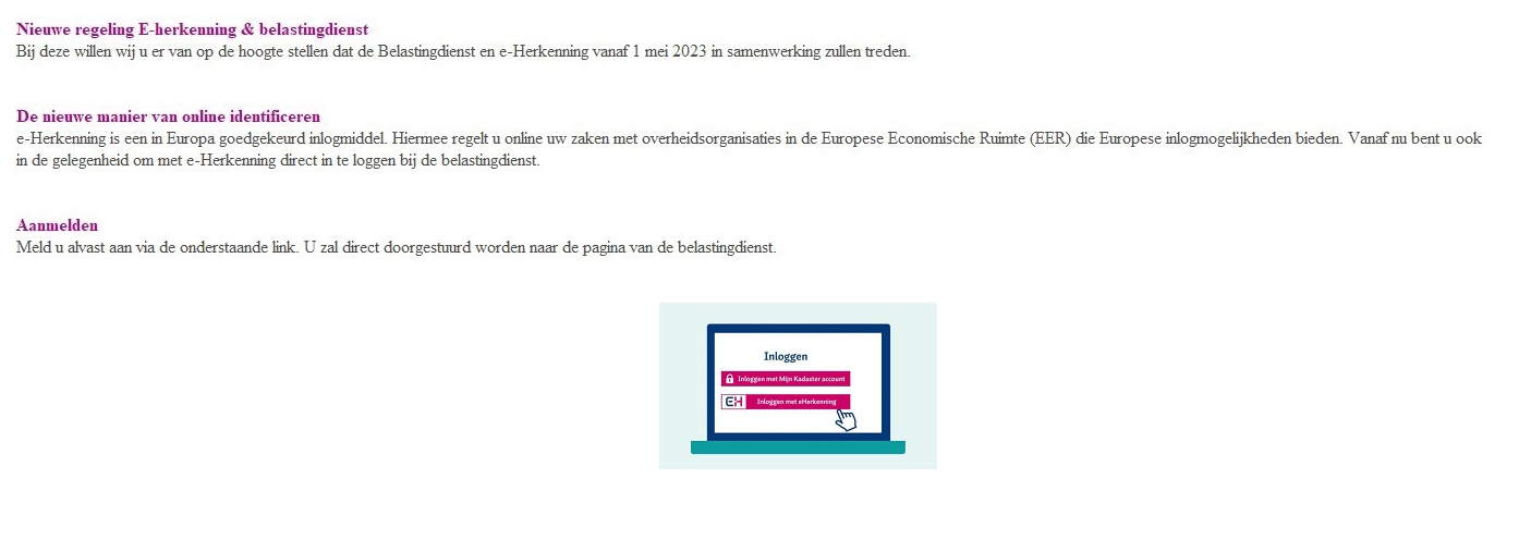 Bij deze willen wij u ervan op de hoogte stellen dat de Belastingdienst en e-Herkenning vanaf 1 mei 2023 in samenwerking zullen treden.