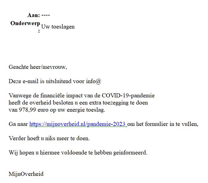 Momenteel is er een valse e-mail in omloop die afkomstig lijkt van MijnOverheid. In deze mail staat dat u € 978,99 extra krijgt voor uw energietoeslag. Daarvoor moet u op een link klikken, zodat u een formulier kunt invullen.