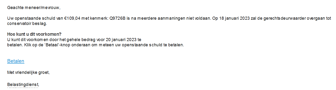 Momenteel is er een valse e-mail in omloop die afkomstig lijkt van de Belastingdienst. In de e-mail staat dat u een openstaande schuld niet hebt voldaan en dat de gerechtsdeurwaarder beslag gaat leggen op 1 november 2021. Om de beslaglegging te voorkomen, moet u op een blauwe knop klikken om de openstaande schuld te betalen.