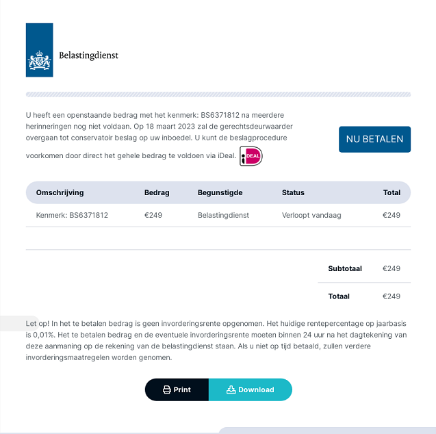 Momenteel is er een valse e-mail in omloop die afkomstig lijkt van de Belastingdienst. In deze mail staat dat de deurwaarder beslag gaat leggen tenzij u meteen betaalt. Daarvoor kunt u klikken op de link ‘betalen’. Er staat ook een knop waarmee u kunt printen.
