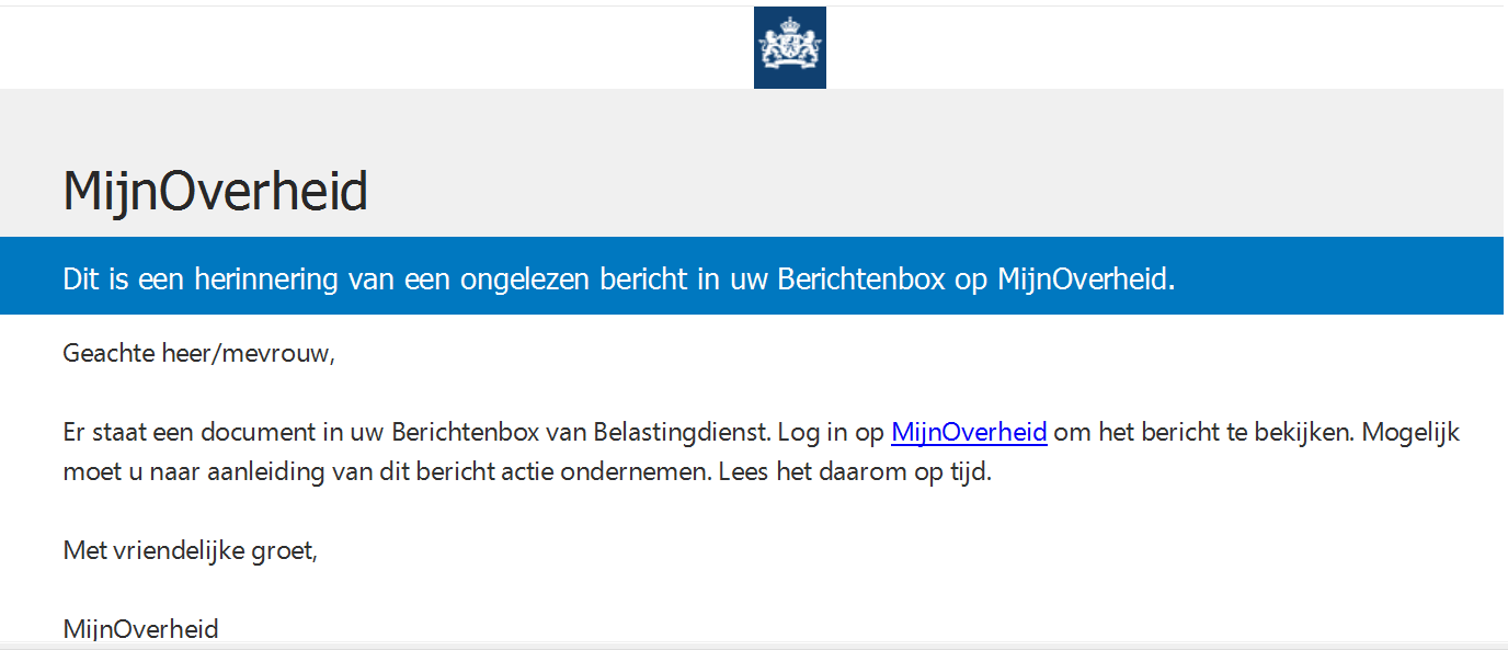 Momenteel is een valse e-mail in omloop. Hierin lijkt het alsof u een nieuwe e-mail van de Belastingdienst hebt ontvangen in de Berichtenbox van MijnOverheid. In de e-mail staat dat u dit nieuwe bericht kunt lezen door op een link te klikken. Wij zullen u nooit vragen om via een link naar de Berichtenbox te gaan. Dit is een valse e-mail. In de mail valt verder op dat 'Belastingdienst' niet met een hoofdletter is geschreven.