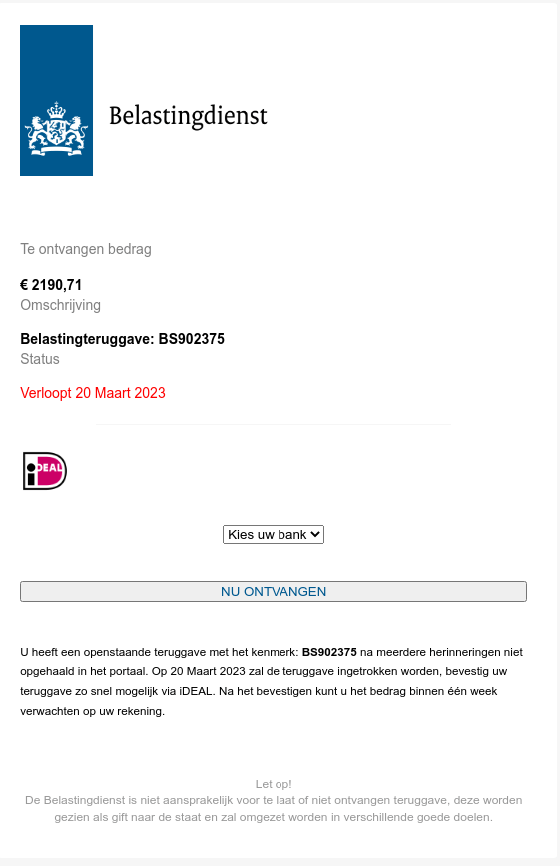 Momenteel is er een valse e-mail in omloop die afkomstig lijkt van de Belastingdienst. In de e-mail staat dat u in aanmerking komt voor een terugbetaling. Om het bedrag te ontvangen, moet u klikken op de tekst 'Mijn teruggave aanvragen' onderaan de e-mail.