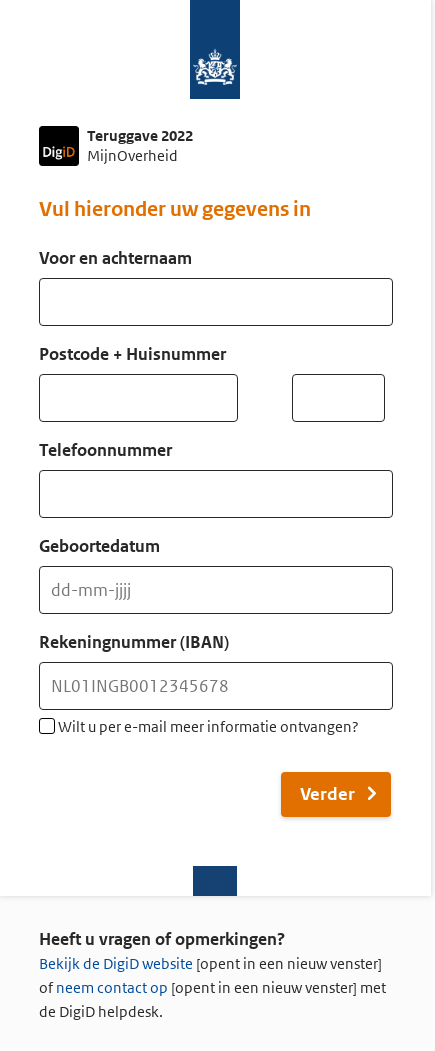 Om uw teruggave te ontvangen vragen wij u om uw gegevens te controleren en te verifieren. Uw fiscale terugbetaling kan alleen op uw bankrekening worden bijgeschreven als wij beschikken over de juiste gegevens.